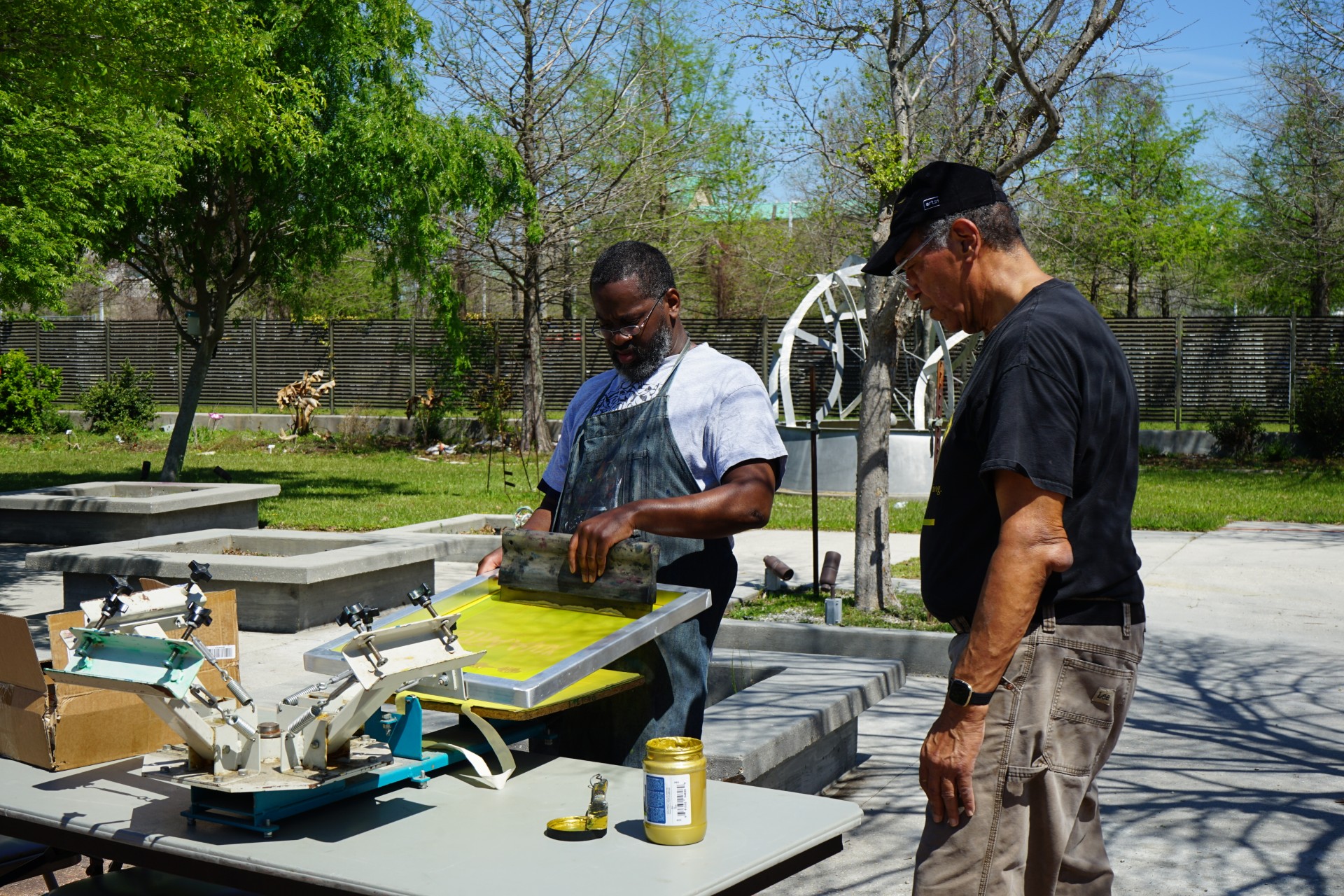 Augustus Jenkins Jr. works on a piece of art with Ron Bechet.