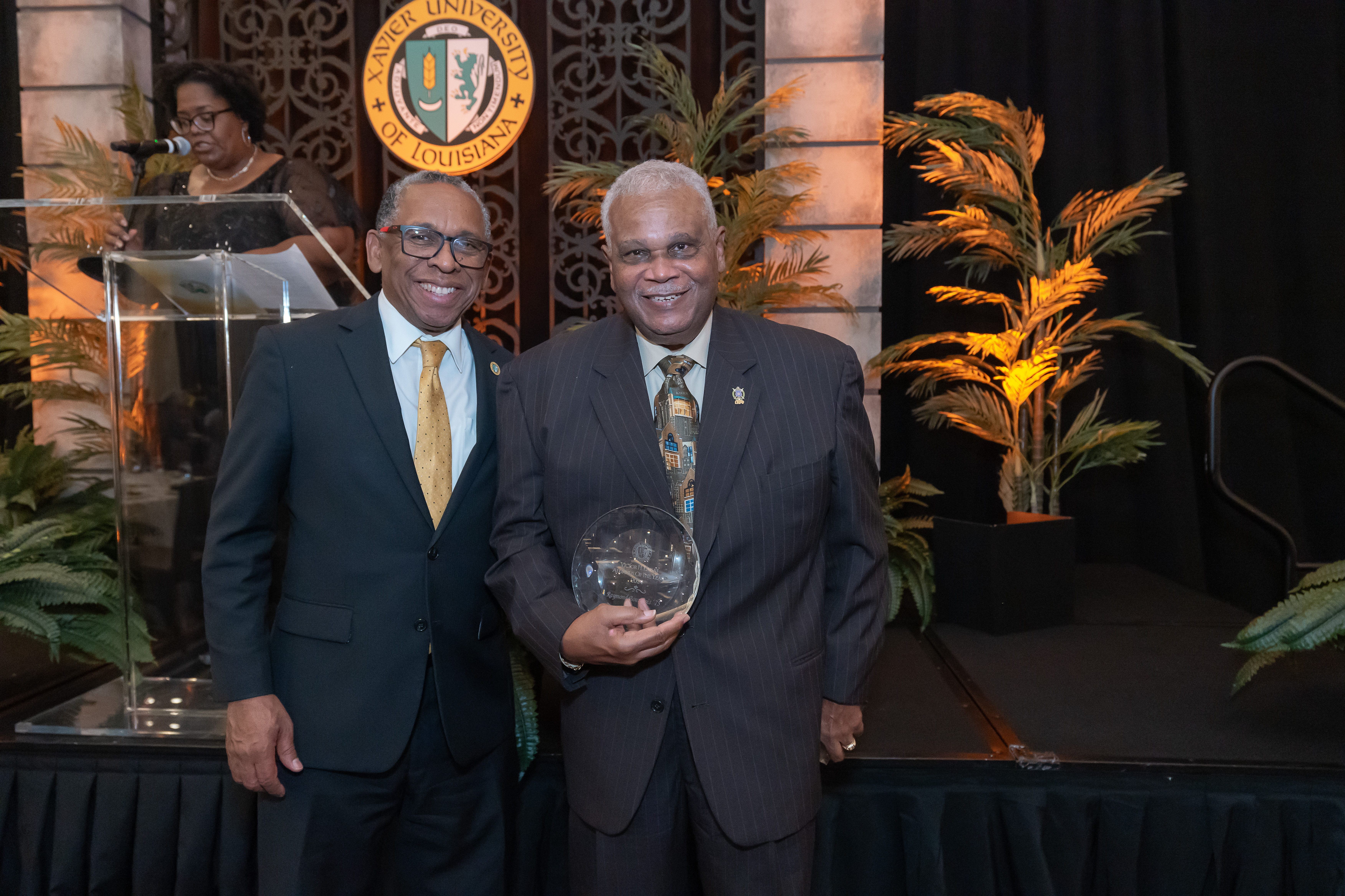 Raymond Bourgeois poses with President Verret at the Homecoming Banquet in 2024 as he was named the '24-'25 Alumnus of the Year.